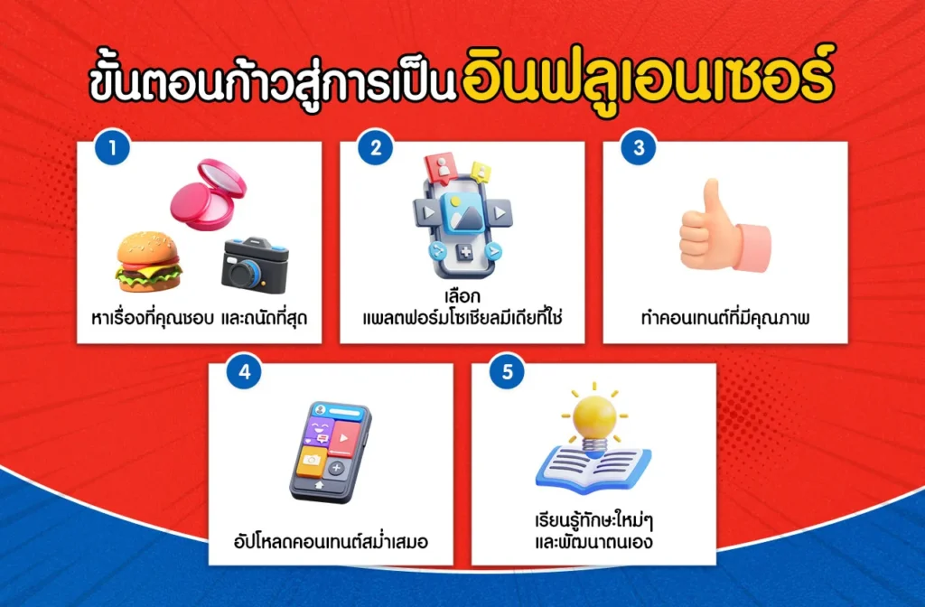 อ่านมาถึงตรงนี้ พี่ ๆ หลายคนคงอยากรู้แล้วใช่ไหมครับว่า วิธีเป็นอินฟลูเอนเซอร์ ต้องทำอย่างไร น้องสมหวังได้สรุป 5 ก้าวง่าย ๆ ที่จะช่วยให้พี่เริ่มต้นเส้นทางการเป็นอินฟลูเอนเซอร์ได้อย่างมั่นใจ มาดูกันเลยครับ
