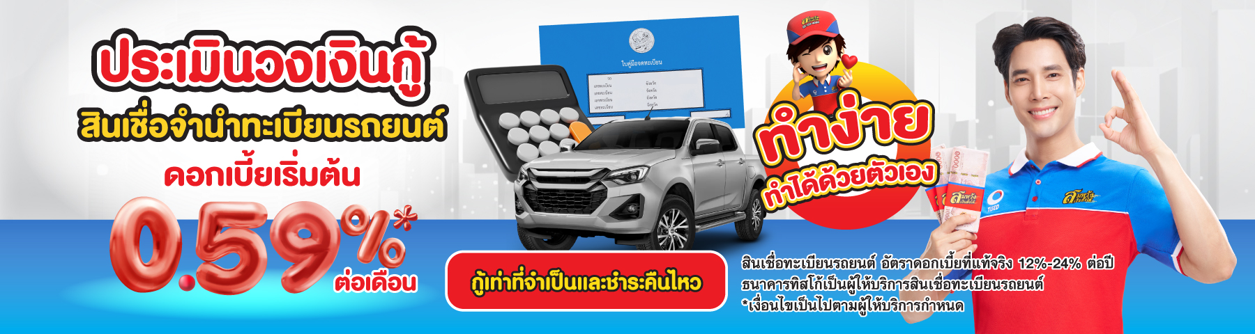 ธนาคารทิสโก้เป็นผู้ให้บริการสินเชื่อทะเบียนรถยนต์ *เงื่อนไขเป็นไปตามที่ผู้ให้บริการกำหนด