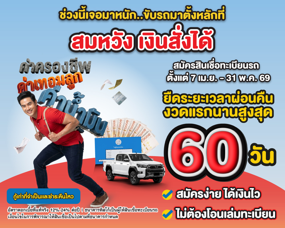 สมัครสินเชื่อทะเบียนรถ ตั้งแต่ 7 เม.ย. – 31 พ.ค. 69 ยืดระยะเวลาผ่อนคืนงวดแรกนานสูงสุด 60 วัน