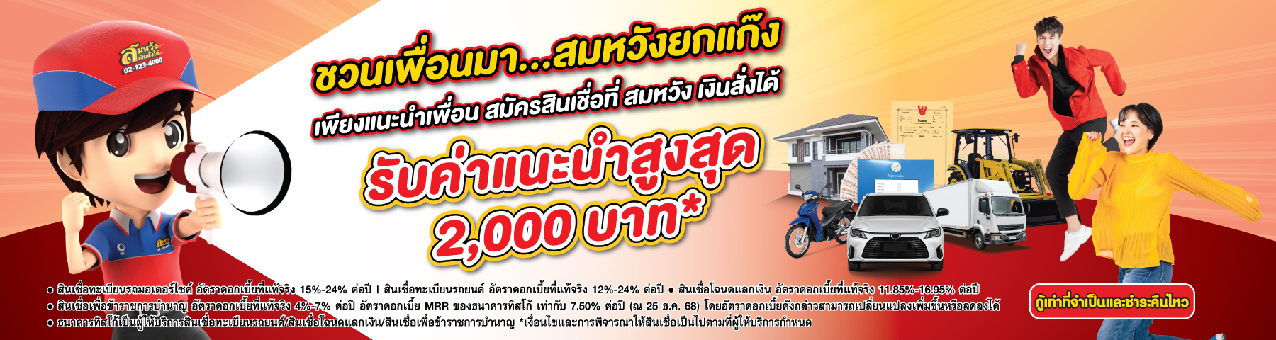 ต้องการเงินด่วน! แนะนำสินเชื่อจำนำทะเบียนรถกับสมหวัง เงินสั่งได้ ชวนเพื่อนมาสมหวังยกแก๊ง รับค่าแนะนำสูงสุด 2,000 บาท
