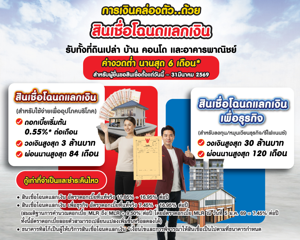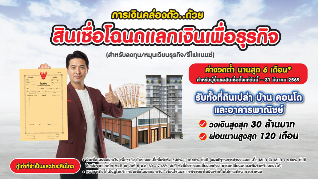 การเงินไม่สะดุด แค่มีโฉนด สินเชื่อโฉนดแลกเงินจัดเต็มสูงสุด 3 ล้านบาท*