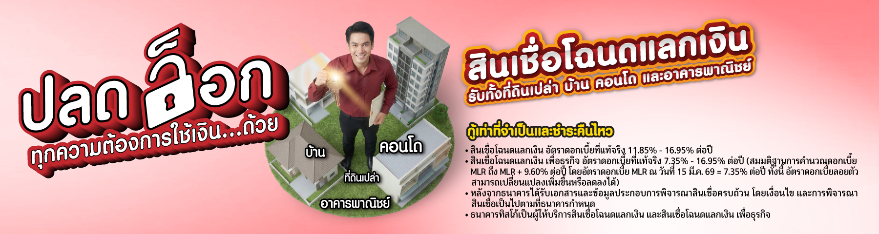 - สินเชื่อโฉนดแลกเงิน เพื่อธุรกิจ อัตราดอกเบี้ยที่แท้จริง 7.35% – 16.95% ต่อปี (สมมติฐานการคำนวณดอกเบี้ย MLR ถึง MLR +9.60% ต่อปี โดยอัตราดอกเบี้ย MLR ณ วันที่ 15 มี.ค. 69 = 7.35% ต่อปี ทั้งนี้อัตราดอกเบี้ยลอยตัวสามารถเปลี่ยนแปลงเพิ่มขึ้นหรือลดลงได้)