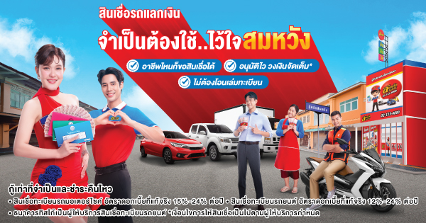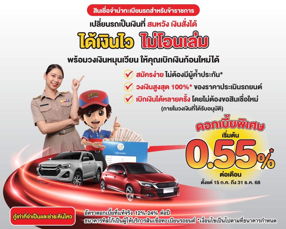 สินเชื่อทะเบียนรถยนต์ อัตราดอกเบี้ยที่แท้จริง 12%-24% ต่อปี ธนาคารทิสโก้เป็นผู้ให้บริการสินเชื่อทะเบียนรถยนต์ *เงื่อนไขการให้สินเชื่อเป็นไปตามผู้ให้บริการกำหนด