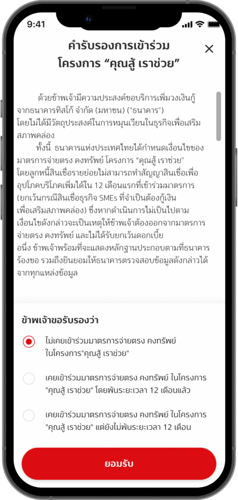 ตอบคำถามการเข้าร่วมโครงการ คุณสู้ เราช่วย และกดปุ่ม “ยอมรับ”