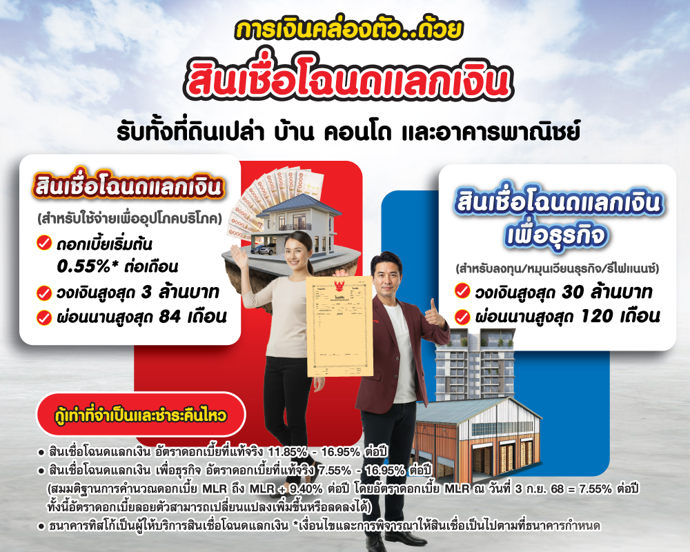 การเงินไม่สะดุด แค่มีโฉนด สินเชื่อโฉนดแลกเงินจัดเต็มสูงสุด 3 ล้านบาท*